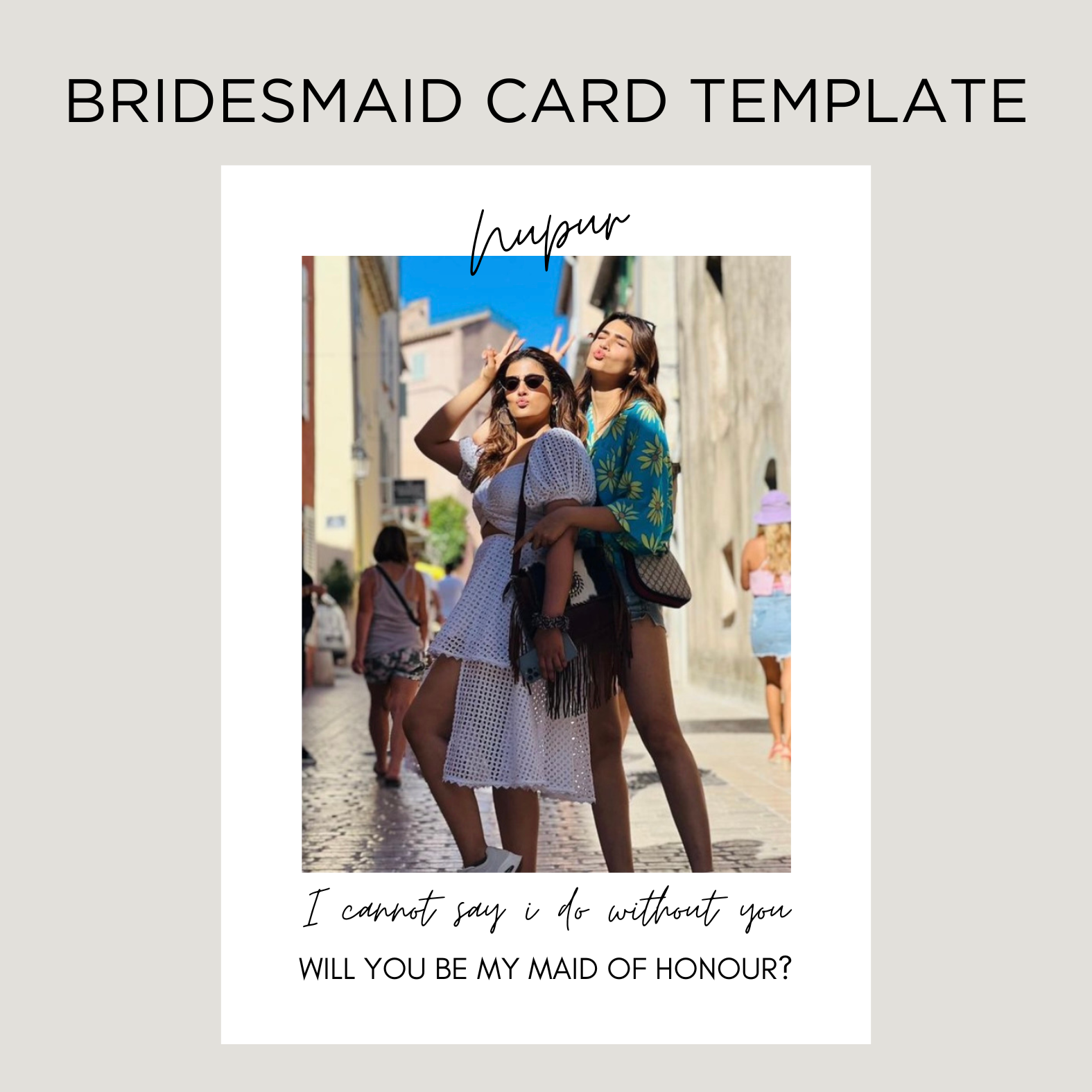 Show your appreciation to your future bridesmaids with a heartfelt and classic thank you card. Upload your pictures with your bridesmaid(s).